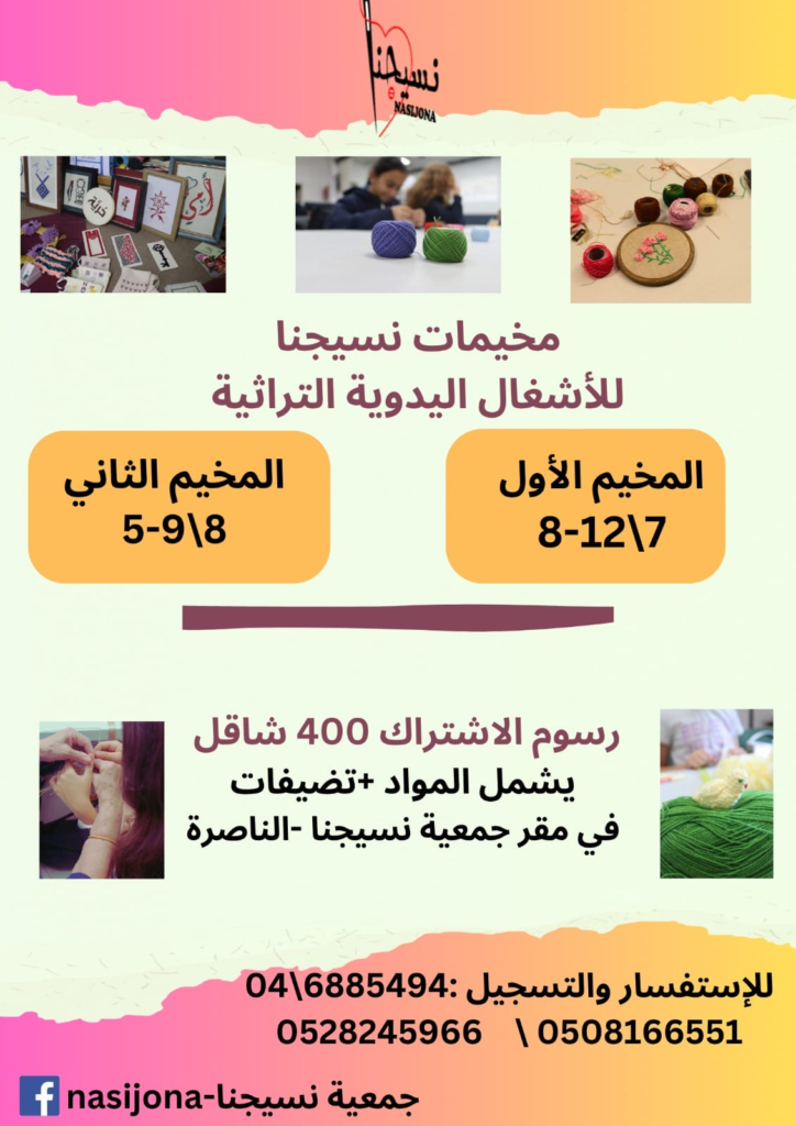 تعلن جمعية نسيجنا عن بدء التسجيل للمخيمات الصيفية التراثية لتعليم الأشغال اليدوية ، على مدار 8 سنوات تقيم جمعية نسيجنا مخيماتها الصيفية مع سيدات متمرسات في الأشغال اليدوية المخيم يشمل تعليم أشغال يدوية متنوعة مثل : الصنارة ، التطريز ، دمى من الصنارة ، القش ، الخرز ، وغيرها من الأشغال اليدوبة ![]()