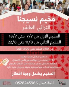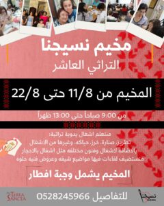 افتتحنا التسجيل لمخيم نسيجنا الصيفي التراثي العاشر والذي سيقام من 11.8.25 وحتى 22.8.25 ويشمل أشغال يدوية بأنواعها المختلفة، من تطريز، صنارة خرز، حياكة، أشغال بالحجارة،…