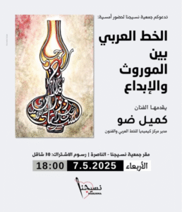 تدعوكم جمعية نسيجنا لحضور أمسية الخط العربي بين الموروث والابداع يقدمها الفنان كميل ضو في مقر جمعية نسيجنا يوم الأربعاء 7.5.2025 الساعة السادسة مساءاً